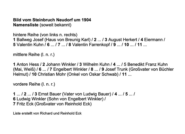 Karl Keller baute Steine für Kommunalbauten, Kirchen, Denkmäler und Privatbauten ab. Verwendet wurde der Sandstein für Massivbauten, Treppen- und Bodenplatten, Fenster- und Türumrahmungen, Denkmäler und in der Steinbildhauerei. Arbeitsfähige Kriegsheimkehrer fanden hier wieder Arbeit. Die Arbeiter aus Schneeberg gingen am frühen Morgen zu Fuß nach Neudorf zur Arbeit im Steinbruch. Schulkinder brachten in der Mittagspause zwischen 11-12 Uhr das Essen nach Neudorf und gingen anschließend wieder in die Schule. Die Arbeit war schwer und der Lohn niedrig.